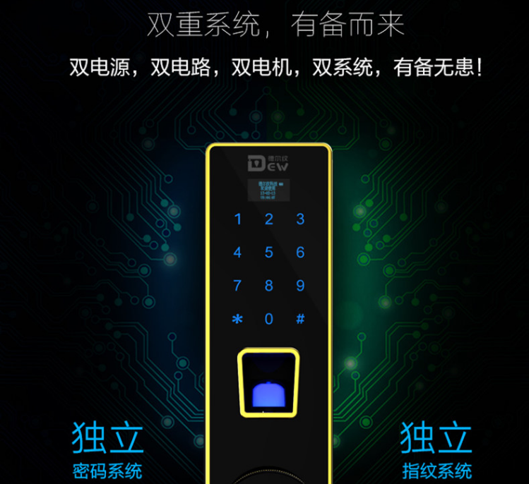 德尔纹智能锁国内首家采用双电源、双电路、双电机、双系统,有效防止无锁孔设计带来的隐患,再也不用担心电机损坏打不开门的情况发生。同时独立的密码系统和指纹系统也大大提高了这把锁的安全系数。