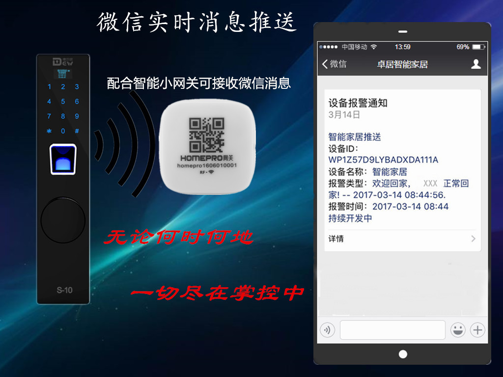 德尔纹智能锁配合卓居智能小网关,可以在手机微信上接收到报警信息,万一家庭成员被坏人挟持,只要用不同的指纹去开锁,家里其他成员就能及时的收到报警消息,及时的进行营救。